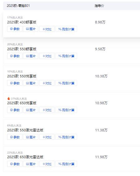 价格因素是影响消费者购车决策的关键变量,零跑 B01 共推出 6 个版本,售价区间为 8.98 万元至 11.98 万元,这样的价格定位对于预算有限的用户群体具有很强的吸引力。以刚步入社会不久的年轻用户为例,他们大多拥有稳定的工作,日常有通勤需求,部分用户还会在周末与朋友自驾出游,对车辆的经济性与续航能力有基本要求。零跑 B01 的入门价格为 8.98 万元,不会给这类用户带来过大的经济负担,且至低配的 430 舒享版续航里程能够满足日常通勤需求,偶尔的短途出游也无需频繁充电。从市场反馈情况来看,零跑 B01 自上市首 周便完成了约一万台下线,交付效率较高,多个汽车平台的数据显示,其用户关注度与销量在同级车型中处于前沿地位,其中 650 悦享版的关注度相对更高,该版本不仅拥有 650 公里的长续航里程,还配备了电动天窗、皮质座椅、360 度全景影像等舒适便利配置,兼顾了续航能力与用车品质。